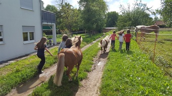 Die Mädels bringen die Ponys nach getaner Arbeit zur Koppel. Jedes Mal ein kleines Highlight für die Kinder!